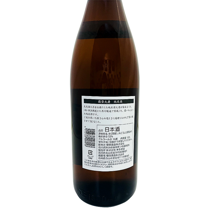 純米酒 能登 大慶 1800ml *地震で倒壊した蔵から救出した酒米を車多酒造で醸造させて頂いた純米酒。
